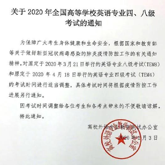 2月3日,高校外语专业教学测试办公室发布通知,原定于3月21日举行的英语专业八级考试和原定于4月18日举行的英语专业四级考试的考试时间将进行适当调整,具体考试时间将根据疫情防控工作进展另行通知。