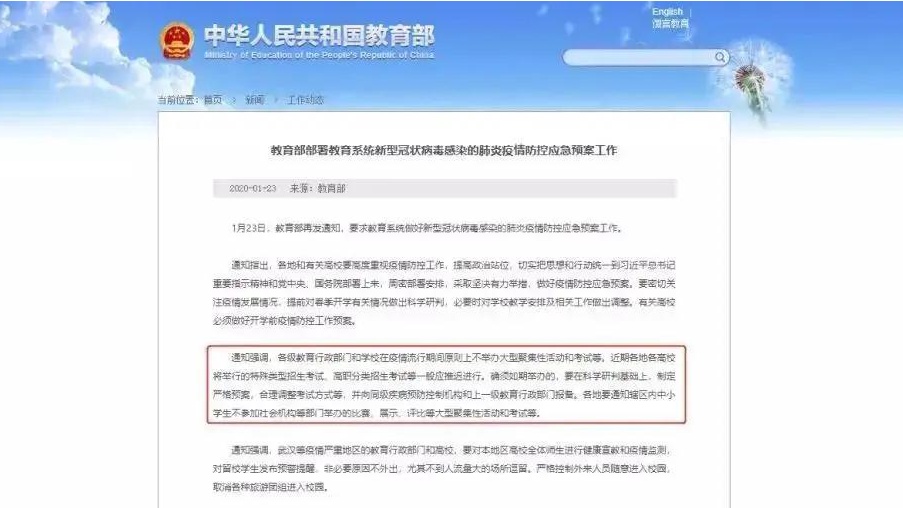 1月24日,教育部下发《教育部部署教育系统新型冠状病毒感染的肺炎疫情防控应急预案工作》,明确指出近期各地各高校将举行的特殊类型招生考试、高职分类招生考试等应推迟进行。