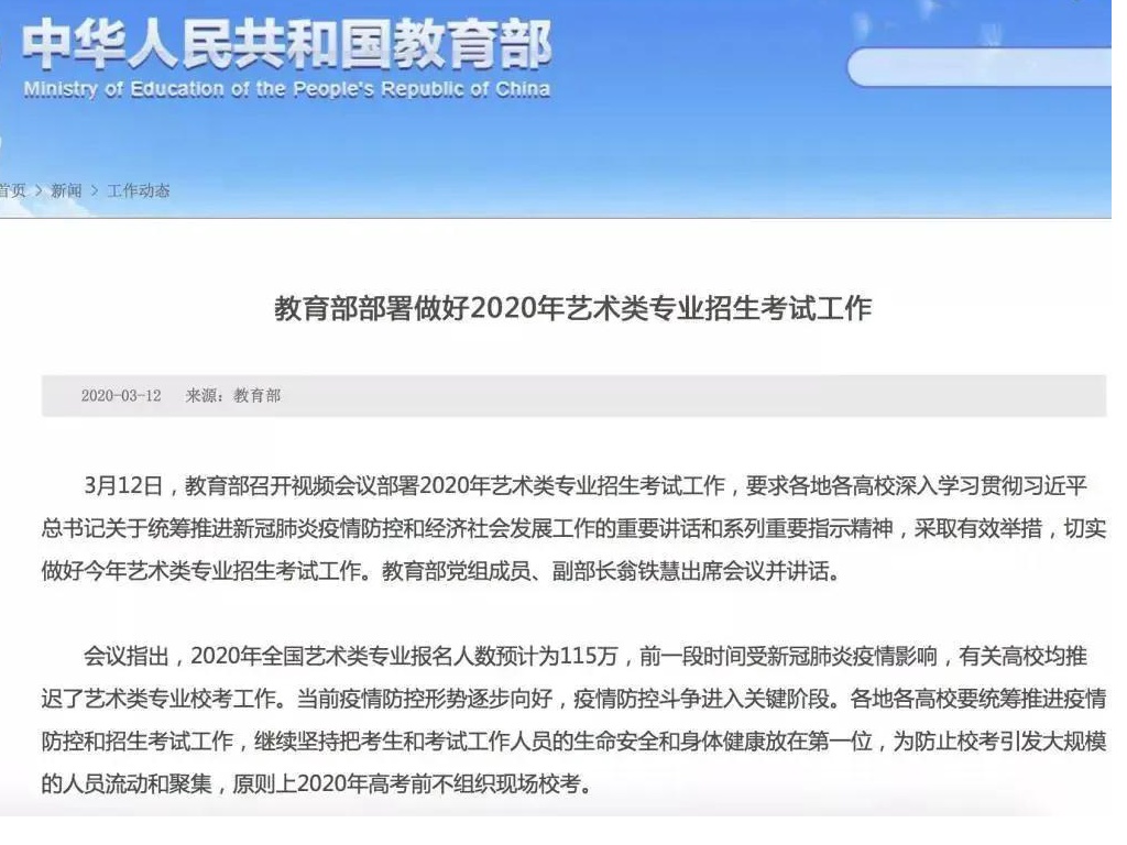 3月12日,教育部召开视频会议部署2020年艺术类专业招生考试工作。会议指出,2020年全国艺术类专业报名人数预计为115万,前一段时间受疫情影响,有关高校均推迟了艺术类专业校考工作。为防止校考引发大规模的人员流动和聚集,原则上2020年高考前不组织现场校考。