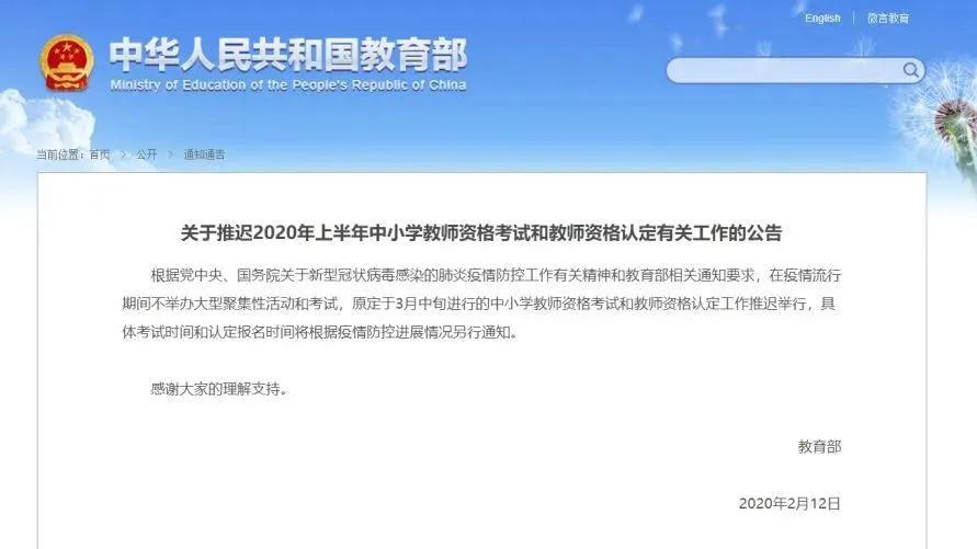 2月12日,教育部发布通知称,原定于3月中旬进行的中小学教师资格考试和教师资格认定工作推迟举行,具体考试时间和认定报名时间将根据疫情防控进展情况另行通知。
