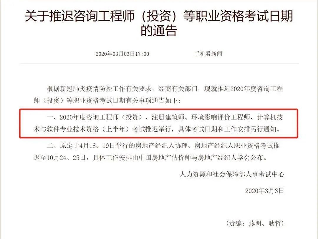 人力资源和社会保障部人事考试中心3月3日发布通告,推迟举行咨询工程师(投资)、注册建筑师、环境影响评价工程师、计算机技术与软件专业技术资格(上半年)考试。