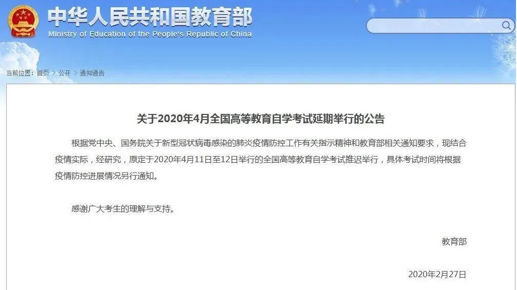 2月27日,教育部发布公告,原定于2020年4月11日至12日举行的全国高等教育自学考试推迟举行,具体考试时间将根据疫情防控进展情况另行通知。
