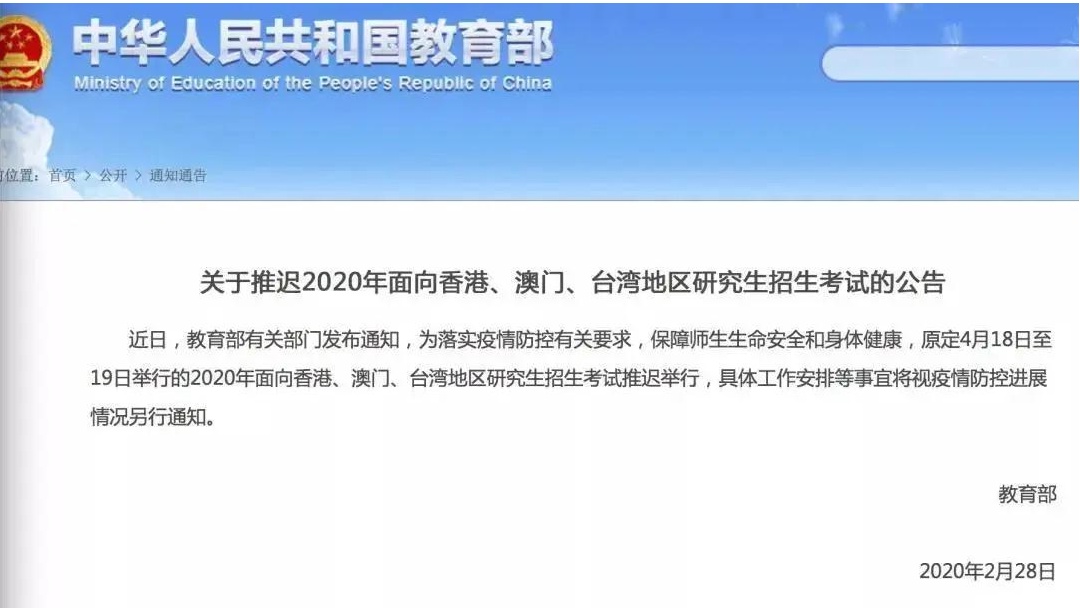 近日,教育部发布通知,原定4月18日至19日举行的2020年面向香港、澳门、台湾地区研究生招生考试推迟举行,具体工作安排等事宜将视疫情防控进展情况另行通知。