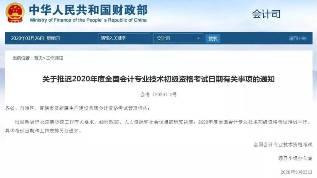 近日,财政部、人社部发布消息,2020年度全国会计专业技术初级资格考试推迟举行,具体考试日期和工作安排另行通知。