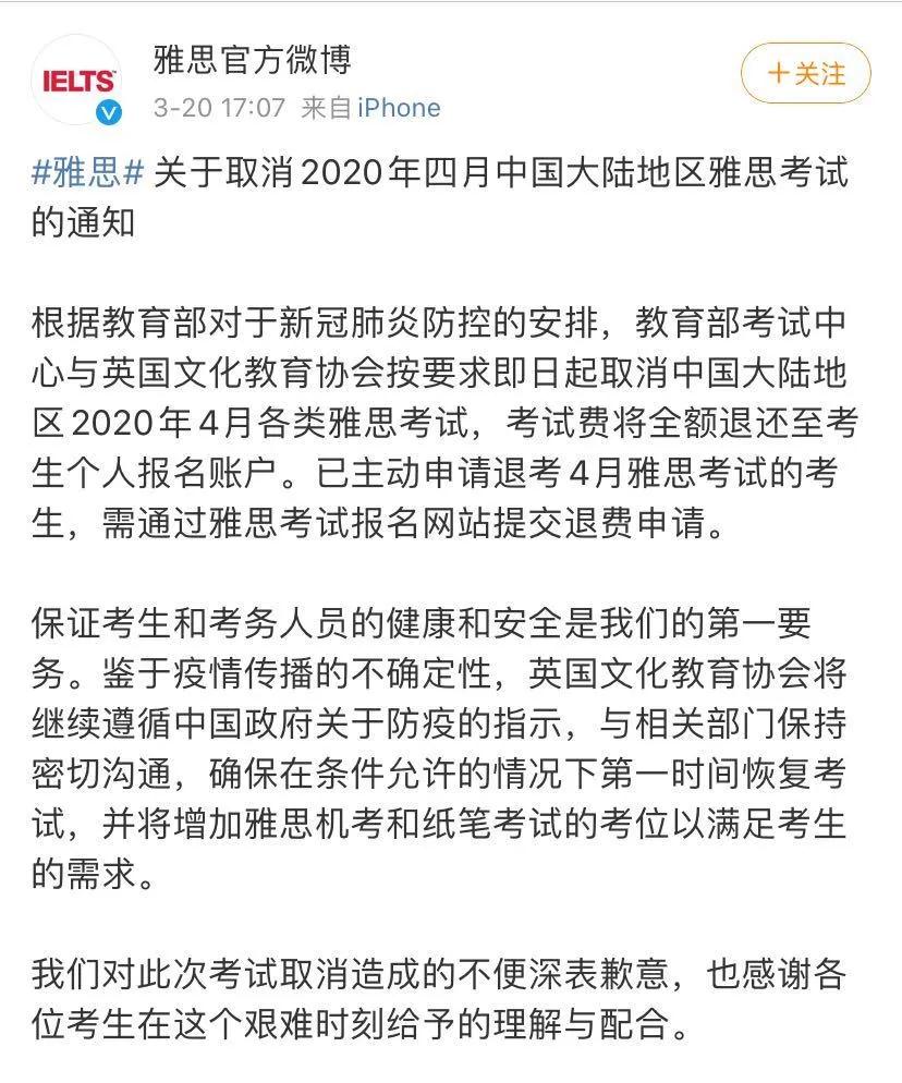 3月20日,教育部考试中心发布通知,决定自即日起在全国范围内取消2020年4月所有托福考试和所有各类雅思考试,考试费将全额退还至考生个人报名账户。
