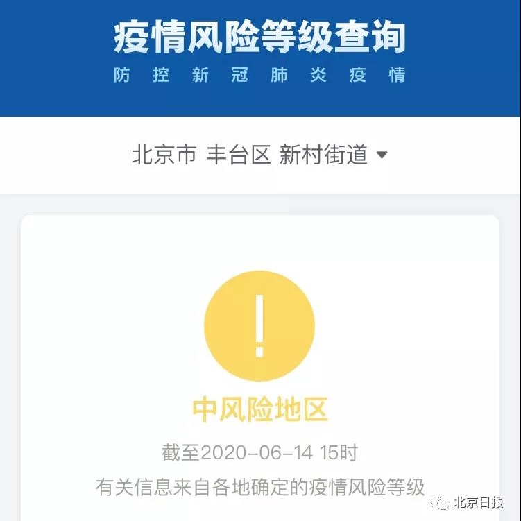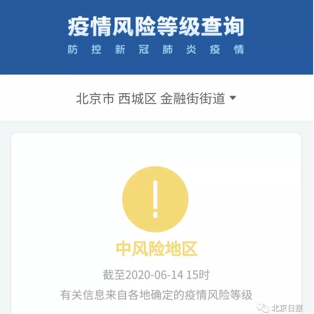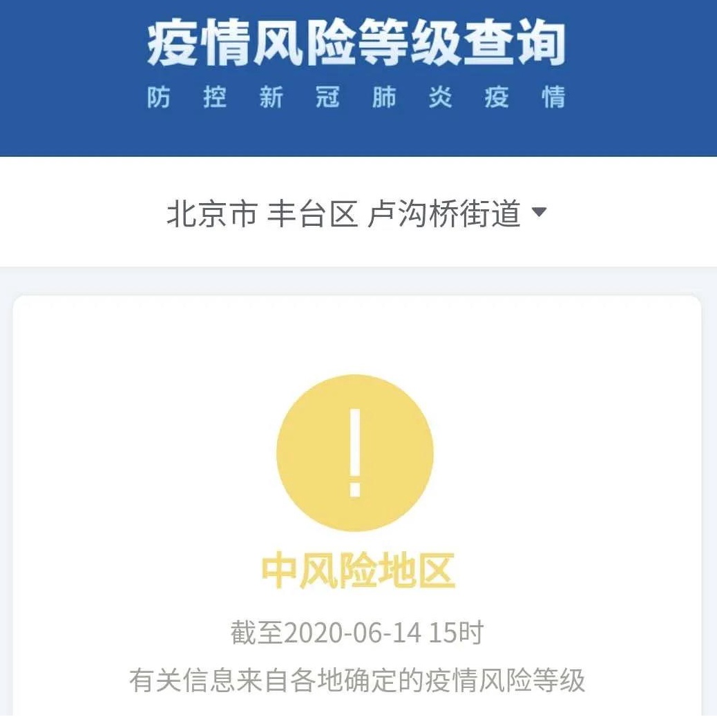 此前在6月13日,根据国务院疫情风险等级查询客户端小程序显示,北京市丰台区西罗园街道、花乡地区、西城区月坛街道、房山区长阳镇疫情风险等级都已升级为中风险地区。(相关报道:北京月坛、西罗园、花乡、长阳四个街道升至中风险地区)