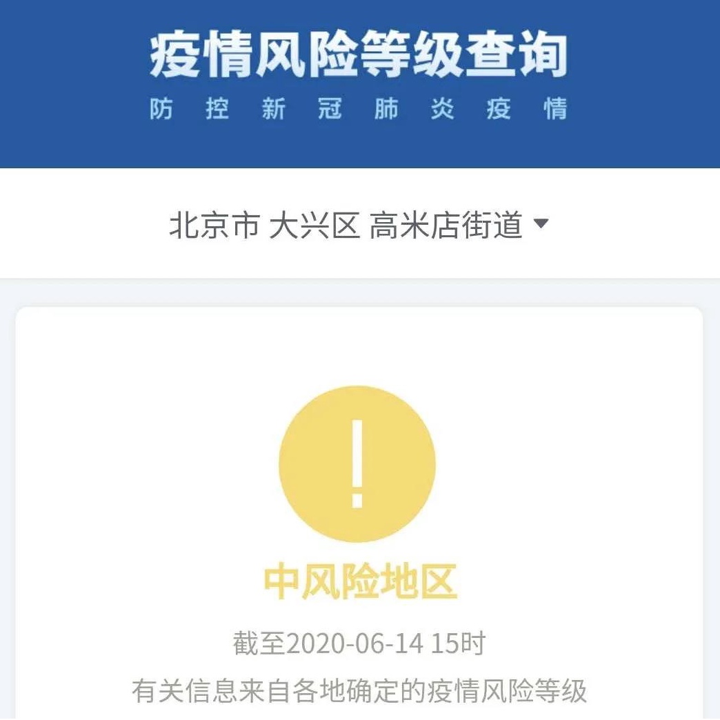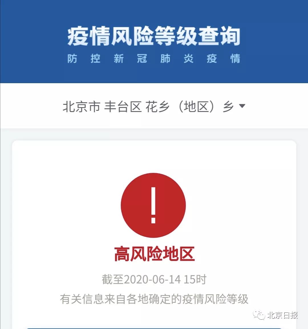 6月14日,根据国务院疫情风险等级查询客户端小程序显示,丰台区花乡疫情风险等级目前已经升级为高风险地区。