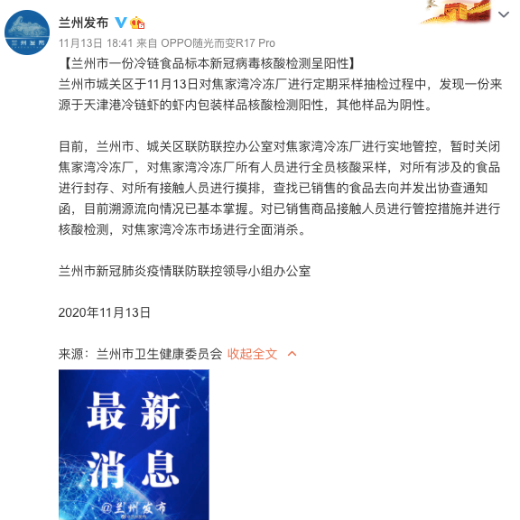 甘肃兰州市卫健委13日通报:兰州市城关区于11月13日对焦家湾冷冻厂进行定期采样抽检过程中,发现1份来源于天津港冷链虾的虾内包装样品核酸检测阳性,其他样品为阴性。