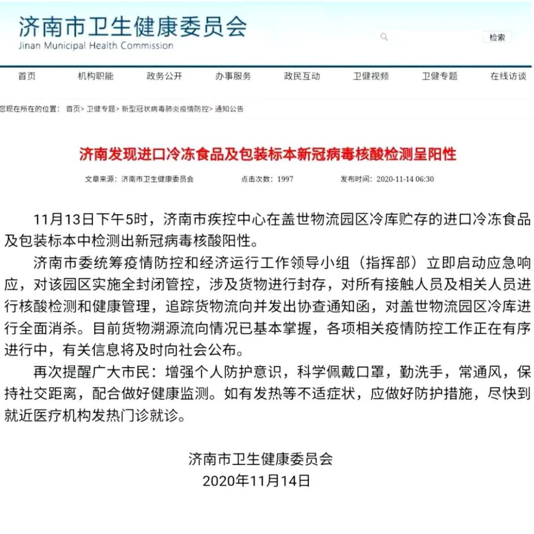 济南市卫健委14日早上通报:11月13日下午5时,济南市疾控中心在盖世物流园区冷库贮存的进口冷冻食品及包装标本中检测出新冠病毒核酸阳性。