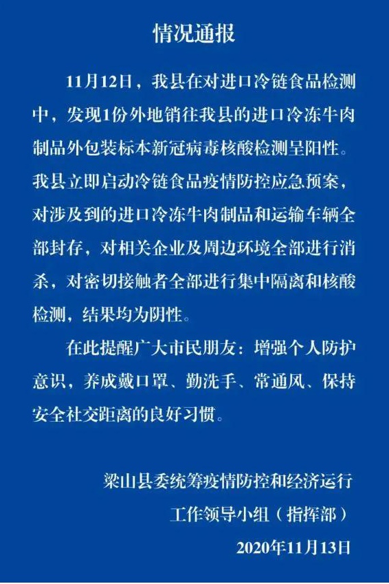 山东梁山县13日报告:11月12日,山东济宁梁山县在对进口冷链食品检测中,发现1份外地销往梁山县的进口冷冻牛肉制品外包装标本新冠病毒核酸检测呈阳性。