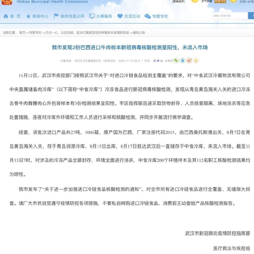 武汉市卫健委13日消息,11月12日,武汉市疾控部门发现从青岛黄岛海关入关的进口冷冻去骨牛肉臀腰肉心外包装样本有3份检测结果呈阳性。
