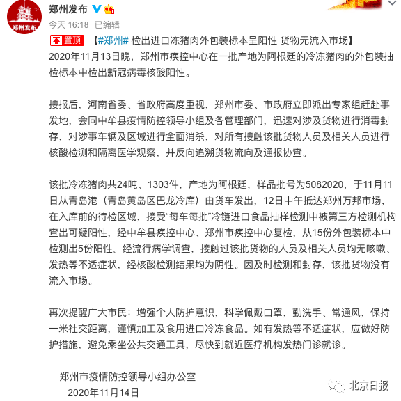 郑州14日下午通报:11月13日晚,郑州市疾控中心在一批产地为阿根廷的冷冻猪肉的外包装抽检标本中检出新冠病毒核酸阳性。