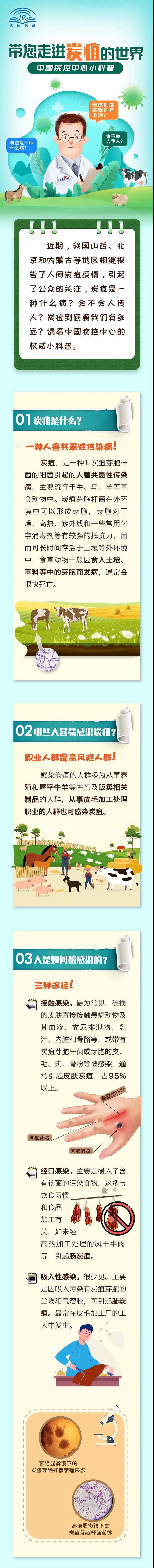 近期,我国山西、北京和内蒙古等地区相继报告炭疽疫情,炭疽是一种什么病?会不会人传人?炭疽到底离我们有多远?中国疾控中心27日发布了科普长图文。