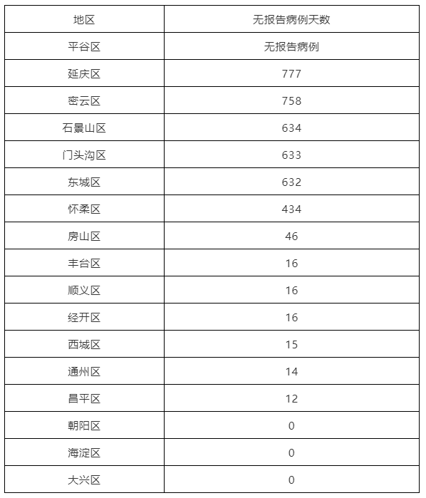 全市16区和经济技术开发区无报告病例天数情况