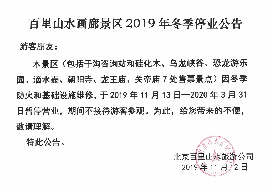 百里山水画廊景区(包括干沟咨询站和硅化木、乌龙峡谷、恐龙游乐园、滴水壶、朝阳寺、龙王庙、关帝庙7处售票景点)因冬季防火和基础设施维修,于2019年11月13日—2020年3月31日暂停营业,期间不接待游客参观。