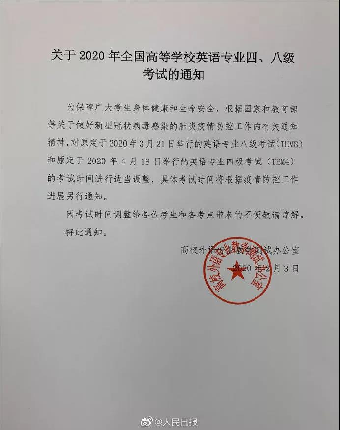高校外语专业教学测试办公室发布通知称,对原定于2020年3月21日举行的英语专业八级考试(TEM8)的考试时间进行适当调整,具体考试时间将根据疫情防控工作的开展另行通知。