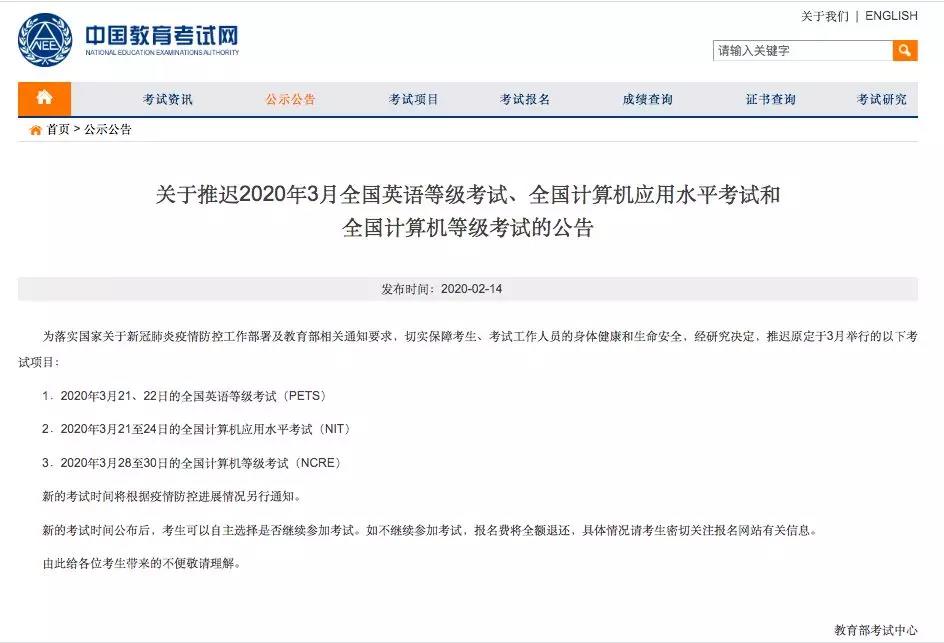 教育部考试中心发布《关于推迟2020年3月全国英语等级考试、全国计算机应用水平考试和全国计算机等级考试的公告》,推迟原定于3月举行的以下考试项目: