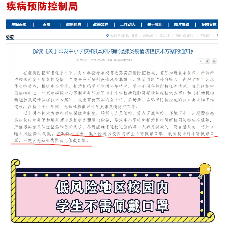 国家卫健委发布通告表示,低风险地区校园内学生不需佩戴口罩,老师授课时不需戴口罩。