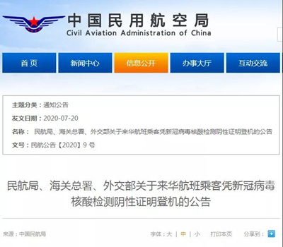 民航局、海关总署、外交部关于来华航班乘客凭新冠病毒核酸检测阴性证明登机的公告