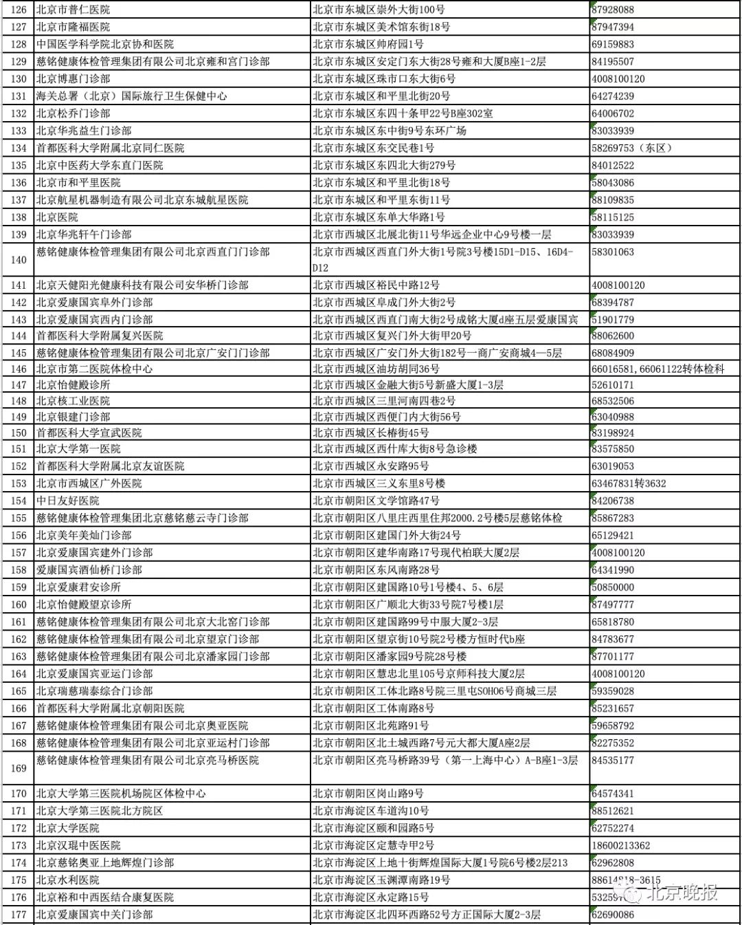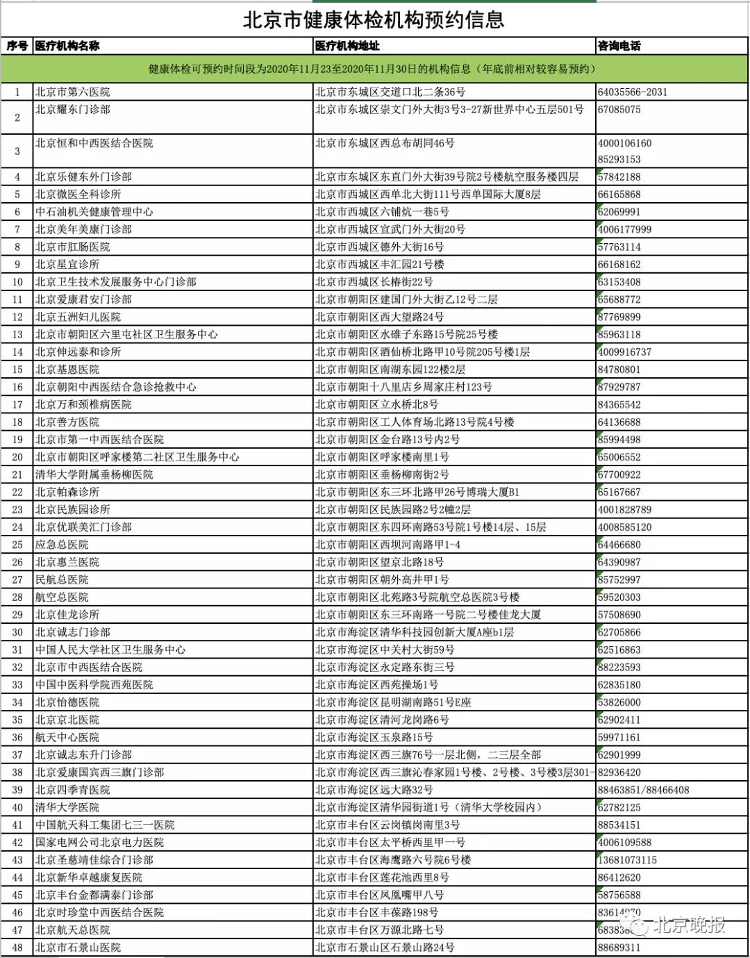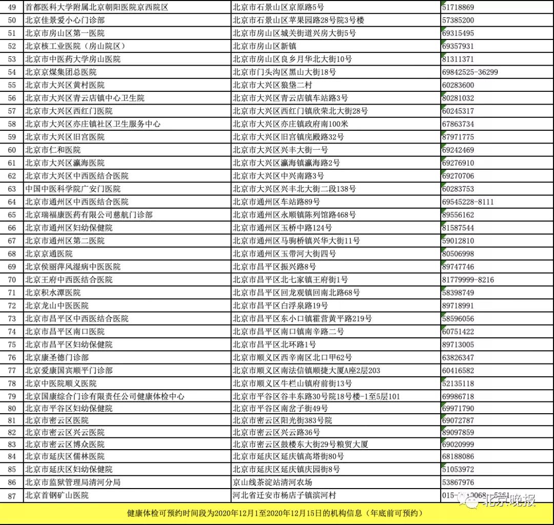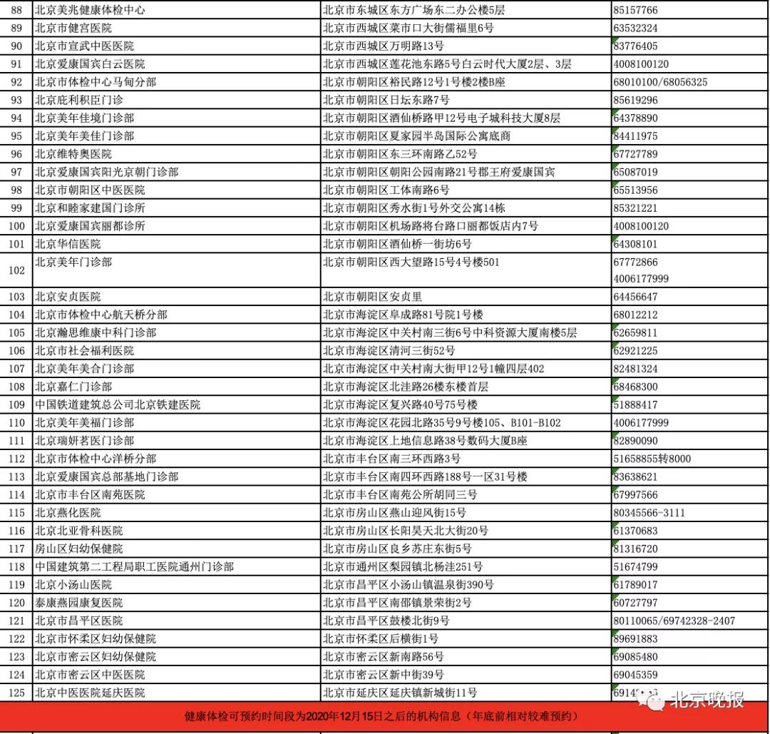 根据常态化疫情防控要求,北京市要求各健康体检机构通过预约方式开展体检服务。为方便有健康体检需求的团体和个人进行预约体检,市卫生健康委对全市具有健康体检资质机构的地址、电话和2020年底前预约情况进行了汇总,昨天对外公布。