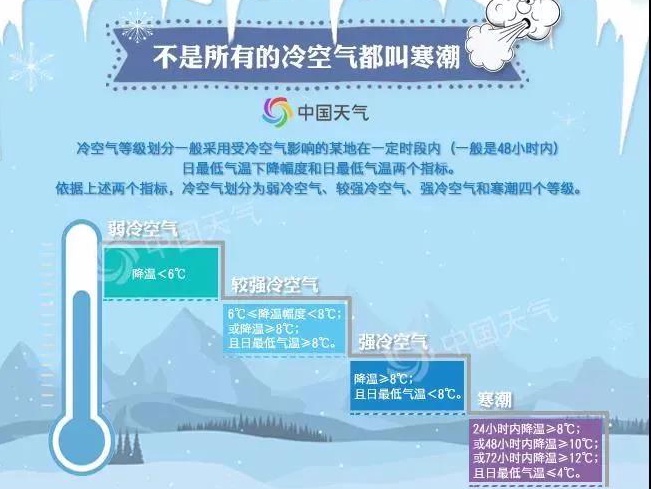 中央气象台2006年制定的我国冷空气等级国家标准中规定寒潮的标准是:某一地区冷空气过境后,气温24小时内下降8℃以上,且最低气温下降到4℃以下;或48小时内气温下降10℃以上,且最低气温下降到4℃以下;或72小时内气温连续下降12℃以上,并且最低气温在4℃以下。