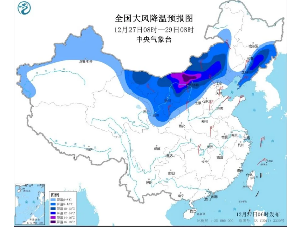预计27日08时至29日08时,新疆北部和西部、甘肃大部、宁夏、陕西中北部、内蒙古中西部、华北北部及东北地区东南部等地气温将下降6~10℃,其中,内蒙古中西部将下降12~14℃;29日早晨,华北平原气温降至-4~-8℃,黄淮至关中平原气温降至0~-4℃;上述地区并伴有4~6级偏北风,阵风可达7~8级。