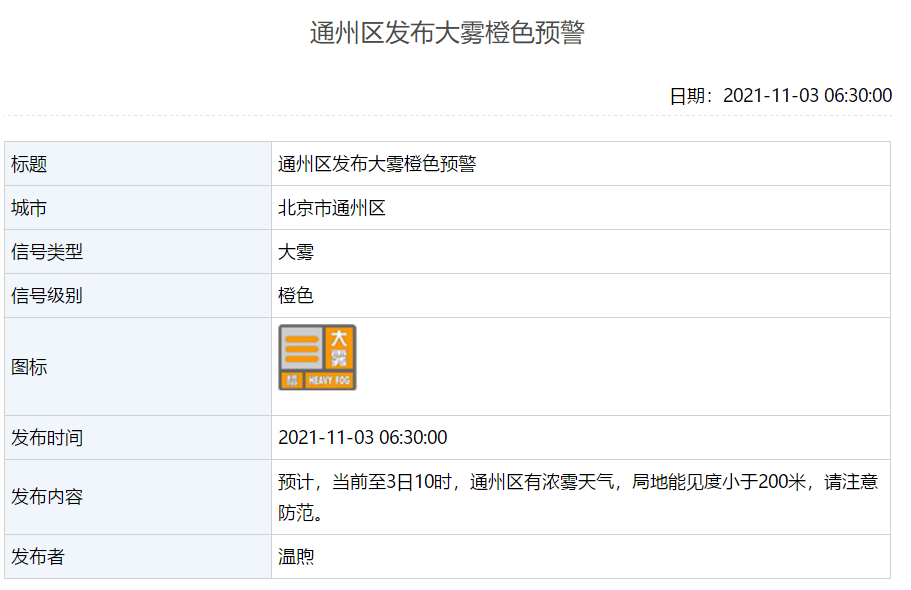 11月3日6时30分,通州区发布大雾橙色预警:预计,当前至3日10时,通州区有浓雾天气,局地能见度小于200米,请注意防范。