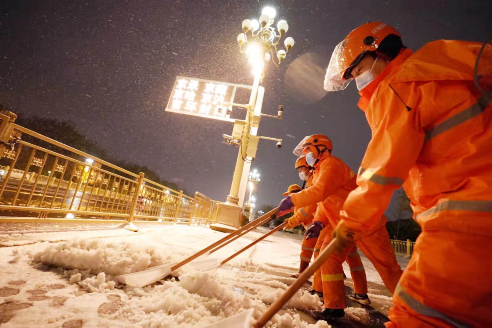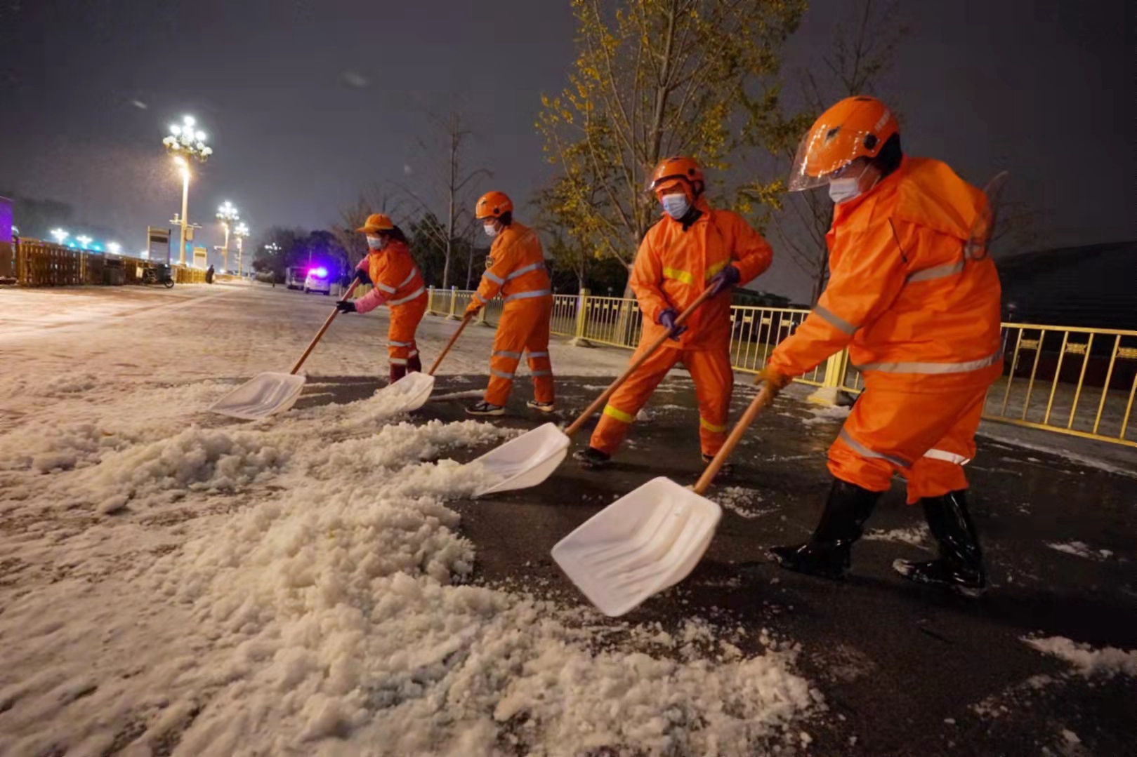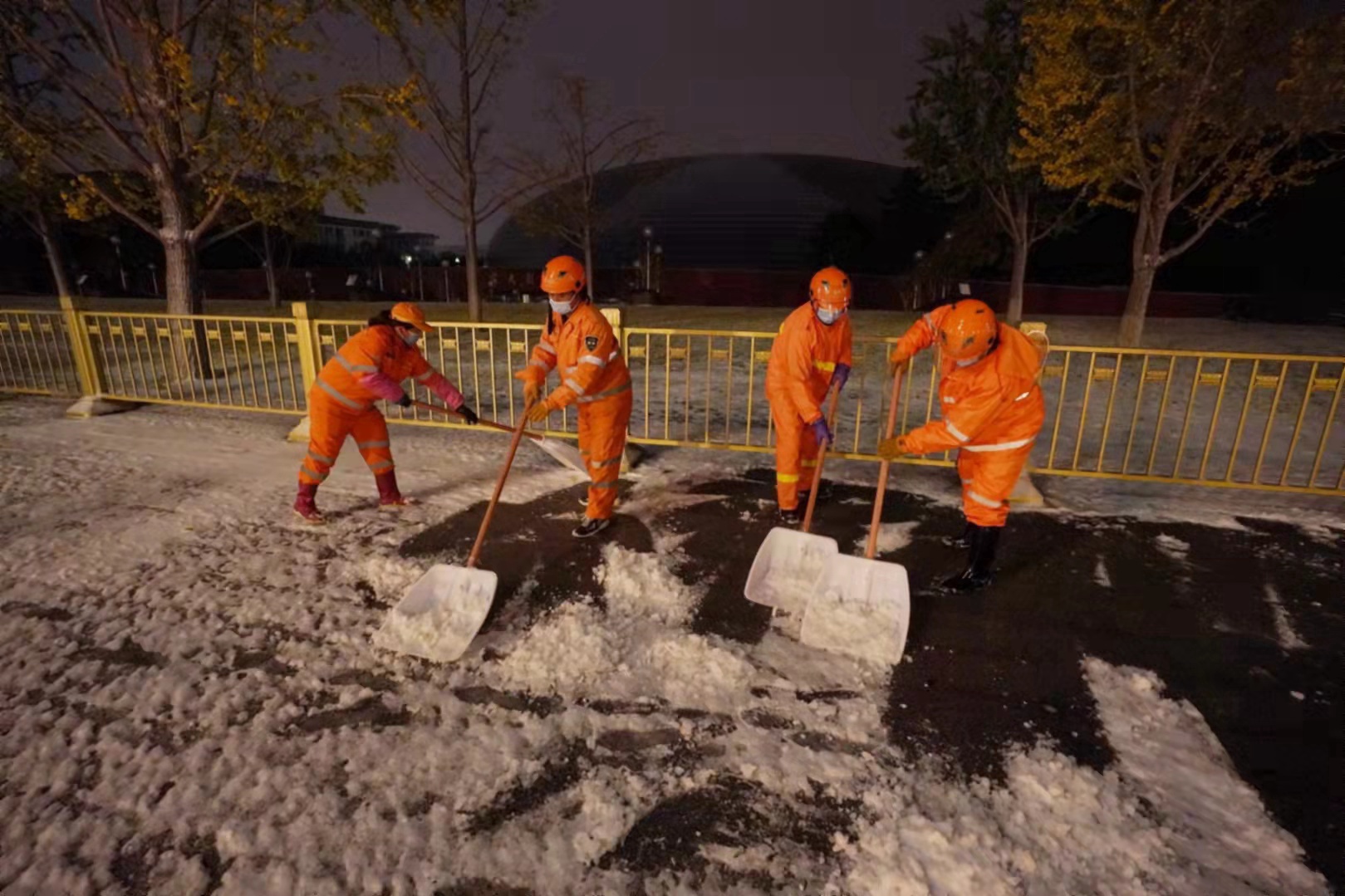 11月7日,立冬节气本市迎来入冬初雪。凌晨五点,北京环雅丽都投资有限公司西城环卫第二分公司的环卫职工及时清除辖区人行步道冰雪,保障市民出行。