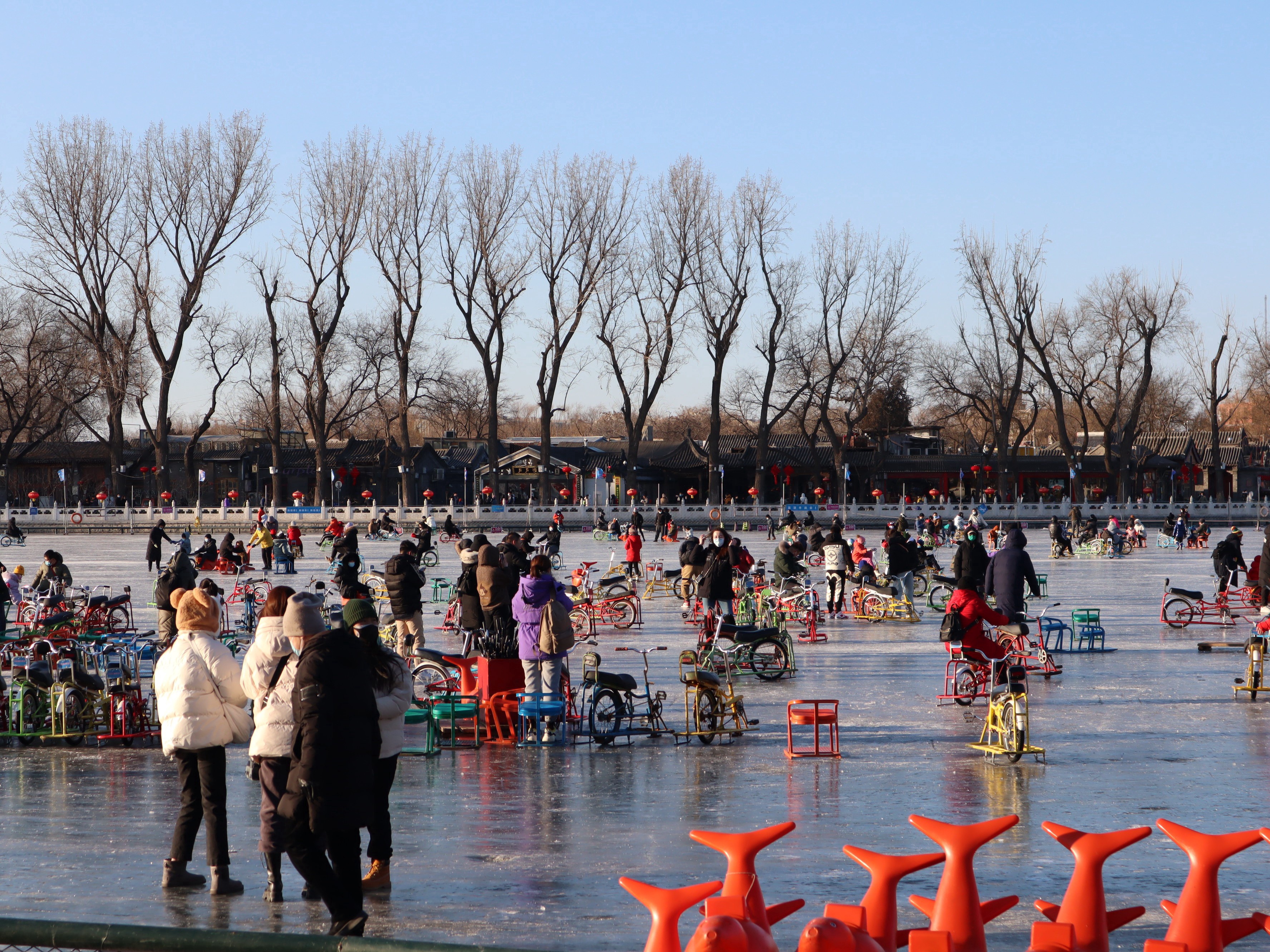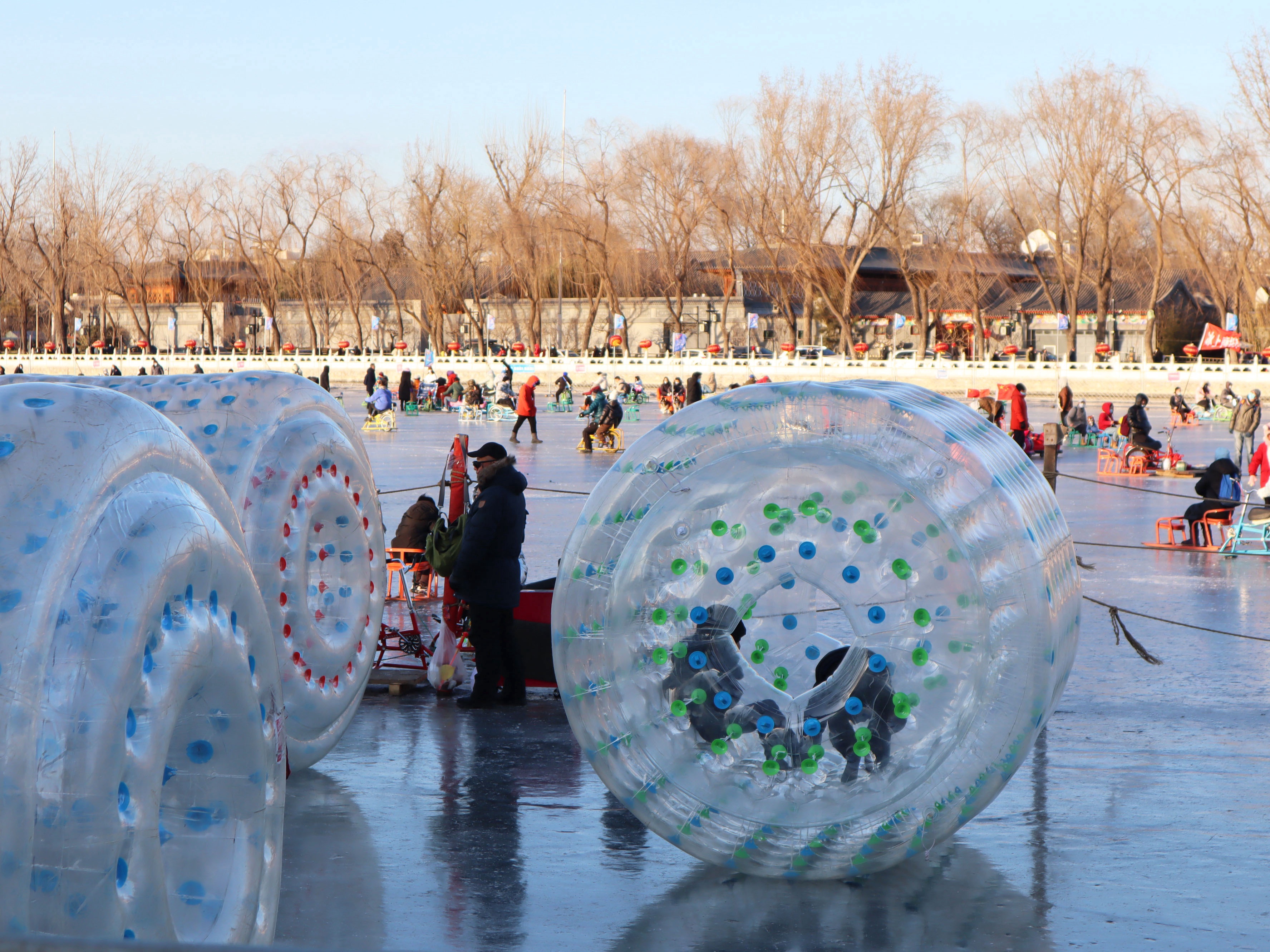 只见冰面上,孩子骑着冰上自行车,你追我赶不亦乐乎。后海北侧的冰上,滑梯和冰上悠波球十分受孩子们青睐,场上都是欢声笑语。