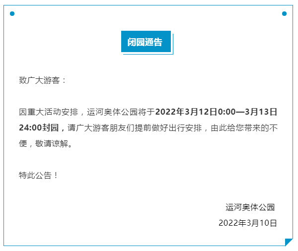 昨天(3月10日),运河奥体公园发布了闭园通告——公园将于3月12日(周六)0:00—3月13日(周日)24:00封园。请广大游客朋友提前做好出行安排。
