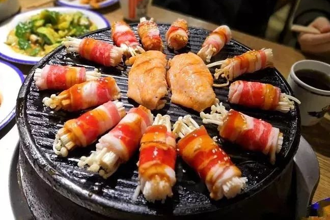 除了传统的牛羊肉,还有一些只有在他家才能吃到的“创新革命款”,辣白菜羊肉、锡纸芝士大虾,还有桌桌必点的肥牛金针菇卷,真的是打开了炙子烤肉新世界的大门!!小编一定要为肥牛金针菇卷疯狂打call~