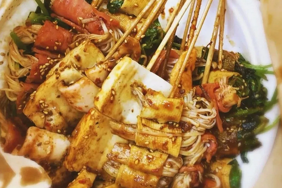 小小的摊可有大大的内容,荤串素串加起来有几十种,烤鱿鱼须、羊肉串、培根金针菇、茄子、鱼豆腐,味道都不错,价格还不贵。