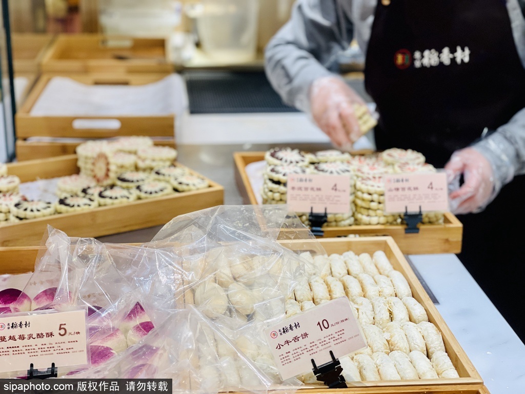 为迎接虎年的到来,北京稻香村各店都推出了生肖虎饼“大王饼”,以及充满美好寓意的“富”“贵”两款节日限定糕点。与此同时,传统糕点、年糕、腊八米、坛子肉、四喜丸子、米粉肉等各类年货产品也已摆上柜台,不少市民已经开始在店里着手选购。