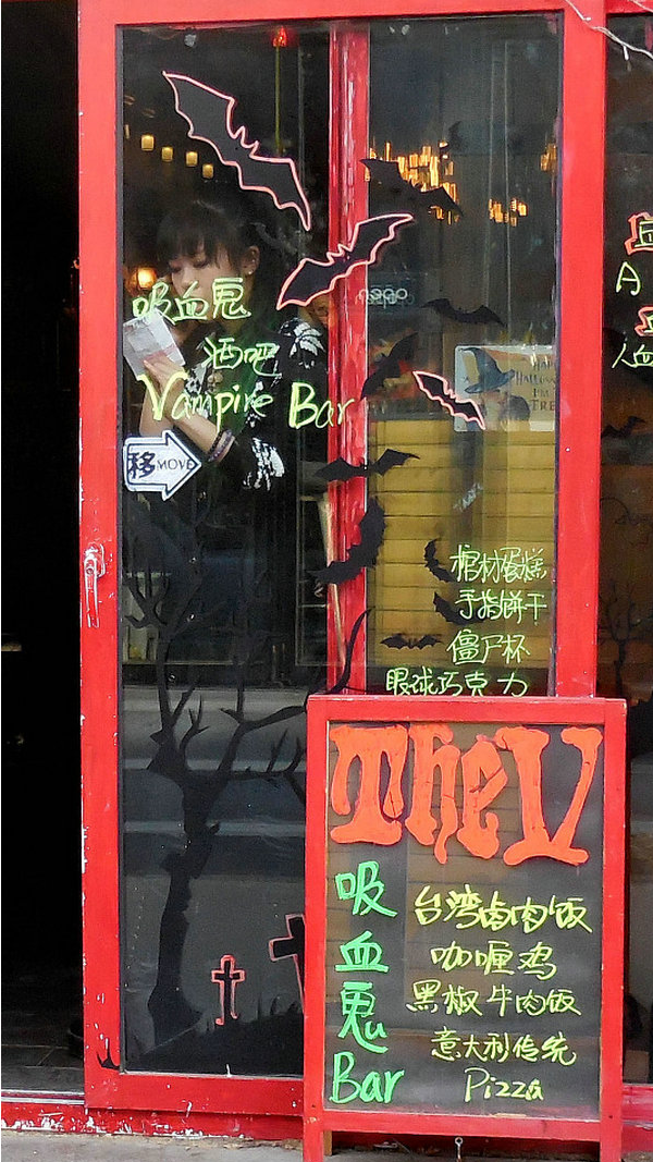 在北京的五道营胡同里有着这么一家店,来看看它家的菜单,”棺材蛋糕 “、”血型“针管酒 、”撒旦之血+地狱“等等。不错,它是一家风格迥异的酒吧——The V吸血鬼酒吧。