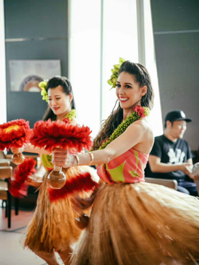 在北京国贸大酒店80层的云•酷酒吧,来自夏威夷檀香山的呼拉舞大师Kiani为大家呈现了一场热情的表演,云•酷酒吧首席调酒师Dicky Hartono则亲自教大家调制了兰博基尼联名款鸡尾酒,来宾们还品鉴了尽然春色的花•遇下午茶。