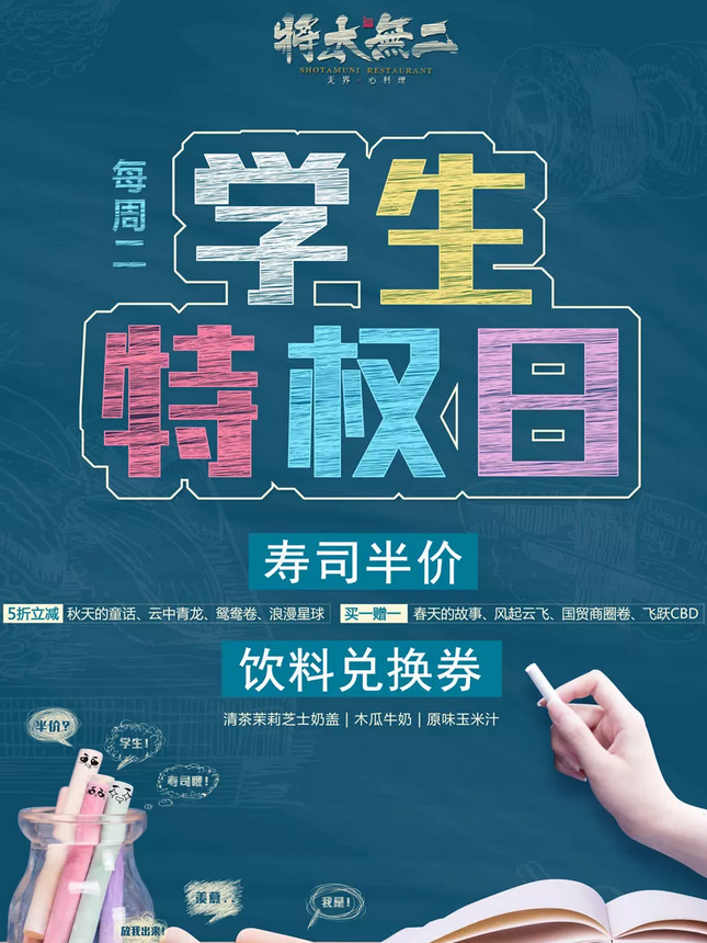 从今天起持学生证每周二在【将太无二】全国任意餐厅,均可享受寿司买一赠一(同等价位,可买赠不同款),或选择半价立减寿司(原价68元仅支付34元)不限制购买次数,不限最低消费, 消费满100元结账时还有惊喜饮料兑换券!赶紧来了解一下我们参与优惠的寿司吧!