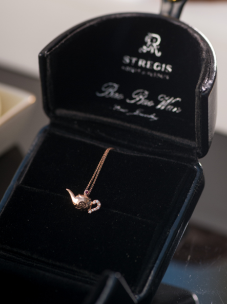 著名高级珠宝设计师万宝宝女士,作为瑞吉鉴赏家,也以瑞吉下午茶仪式为灵感,为瑞吉品牌专属设计了全新珠宝配饰 — 玲珑壶型宝石吊坠。在不及两平方厘米的方寸间,巧妙应用了瑞吉品牌众多元素。珠宝与仪式的完美结合,是一次对瑞吉品牌的深刻解读。