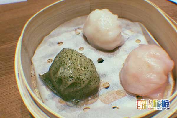 虾饺三温暖:粉红、黄色、黑色,三种颜色分别为鹅肝、蟹黄、松露三种口味,泡在虫草鸡汤里,鸡汤非常浓郁,虾饺皮依然有弹性。每一颗虾饺里都有一大颗新鲜的虾仁,Q弹紧致。