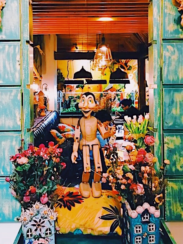 房顶上的玻璃叶子,森林系的装潢,画满来自不同故事中的卡通人物墙面,让这里多了一份童趣。老板从世界各地带回来的玩偶,咖啡饰品布满咖啡厅的每个角落,同时又为这个地方增添了不少的故事感。