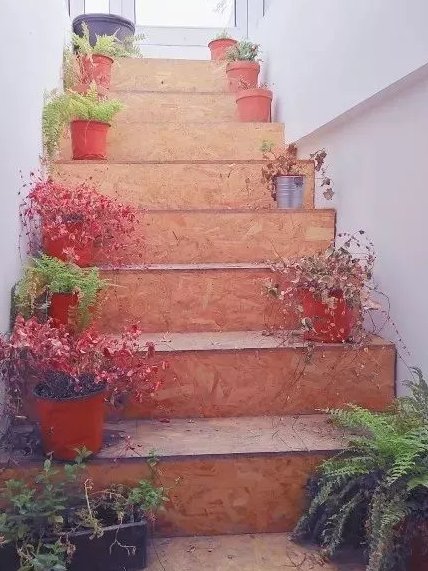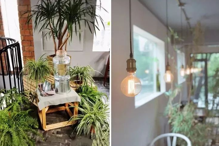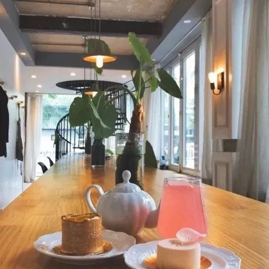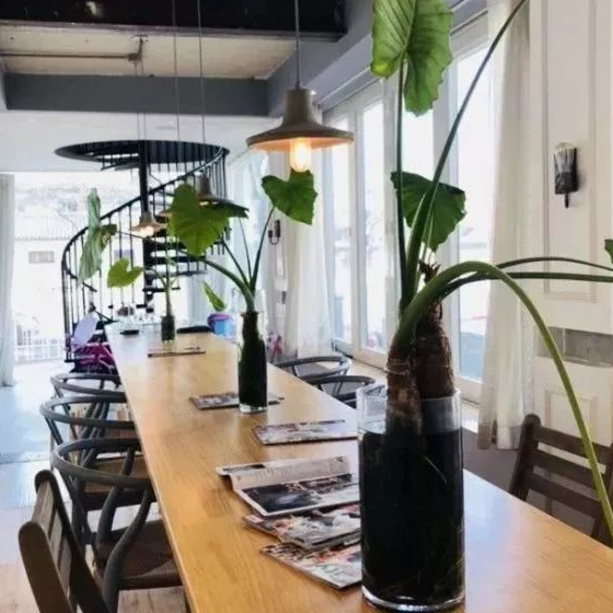 店里分两层一层有一张大大的长桌,随处可见都是明艳的绿植,最吸引人的就是蜿蜒盘旋的旋梯~