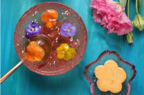 承载童年回忆的冰粉,邂逅来自美国保加利亚的清香玫瑰与草莓果酱,加上一块入口即化的甜蜜凤梨酥,葡萄干、白芝麻和食用花点缀其中,尝一口那年夏天的味道。