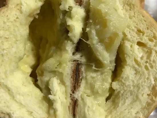 贝果家的榴莲包,外表长得很低调没什么造型,体积不大但是分量真的超级足!外皮的面包特别蓬松也很软,内里真的是超级实在的榴莲果肉,一口咬下幸福炸了!