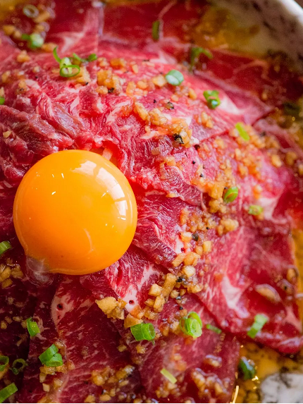 轻轻地戳破蛋黄,蛋液缓缓滑过牛肉表面,再疯狂的搅拌所有食材,齐活儿!搅拌后要马上吃,这样才能保证肉的口感。看这一盘的肉色就感觉不差,吃起来果然是毫无筋膜,入口柔软,没有什么肉腥味也不会咬不烂。薄薄的一层十分好拿捏,嫩滑的牛肉轻咬一口,口感轻盈的不行。加入梨丝,顿时清甜爽脆的口感更容易突出舌尖的鲜味,而且会变得比较多汁。