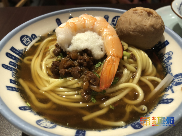 美国CNN都推荐过他家的担仔面,最早也是做担仔面起家的,放了一颗虾,汤头是用虾头煮的,加了秘制的肉燥,口味很温柔;猪蹄是客家风味做法,用特别秘方卤制,软嫩Q弹,很养颜;虾卷是台南风味,配高丽菜、芥末口味的蘸酱,更清爽。