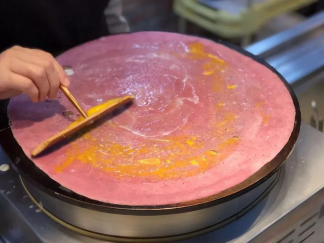 此超市的煎饼果子不简单,太吸睛!第一次见到颜色如此艳丽的煎饼,原来是调了火龙果汁儿和菠菜汁儿。