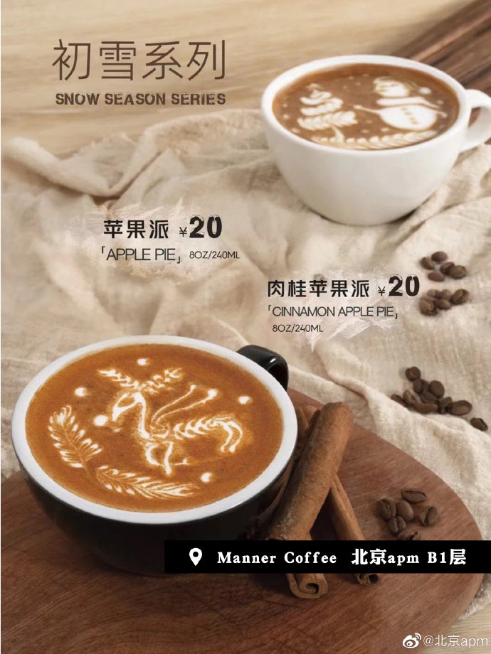 没有肉桂和苹果的冬天不是完整的冬天!Manner Coffee雪季新品「肉桂苹果派」肉桂高调的辛香与焦糖苹果香甜,拉响冬日柔情序曲❄️热烈而悠扬。「苹果派」苹果香甜融于咖啡于燕麦奶中🥛椰子糖微甜🥥是专属于冬日的治愈!