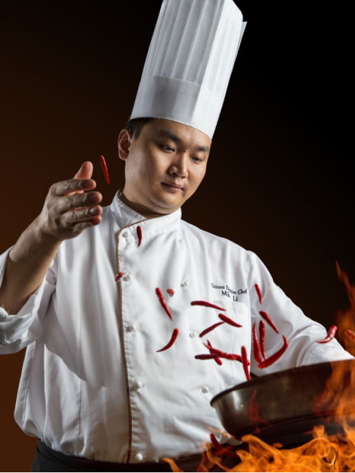 金阁中餐厅,以沉静典雅的东方风韵与祥瑞宁和的中式美学给宾客以雅致感受,由中餐行政总厨亦是粤菜大厨梁志坤坐镇。梁师傅引领厨师团队,同时携手不定期邀请的客座中餐名厨,邀您体验中华美食精粹。此次客座的川菜大厨李明景,其家族在重庆经营餐饮业已有整整三代,家里多位前辈精通川菜烹饪并传承厨艺人生。从小他就耳濡目染享誉世界的川菜文化,并深受父亲和祖父的厨艺熏陶,之后进入四川烹饪高等专科学校学习。在他师从川菜名厨杜飞期间,积累了丰富的经验,获得了终生受益的灵感,帮助他将对自己故乡的热情转化为深入钻研川菜烹饪技艺的动力。