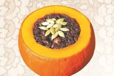 “南瓜八宝饭”是以南瓜、糯米及黑米为主料,当地绿豆、高粱、八宝豆等为配料,用南瓜当器皿,精心烹制的一道甜品美食,“八宝”寓意吉祥,以喜庆丰收表达人们一种祈福愿望,它软糯爽口,深受游客欢迎。