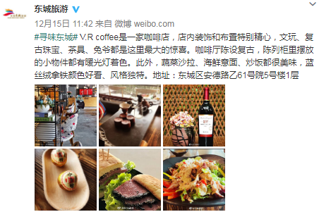 V.R coffee是一家咖啡店,店内装饰和布置特别精心,文玩、复古珠宝、茶具、兔爷都是这里最大的惊喜。咖啡厅陈设复古,陈列柜里摆放的小物件都有暖光灯着色。此外,蔬菜沙拉、海鲜意面、炒饭都很美味,蓝丝绒拿铁颜色好看、风格独特。