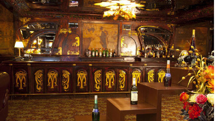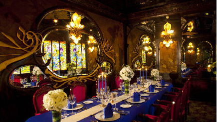 餐厅内枫栗树叶状的吊灯与壁灯散发出幽暗的光,映照着墙上的鎏金藤图案,以及摹绘自卢浮宫的装饰壁画。